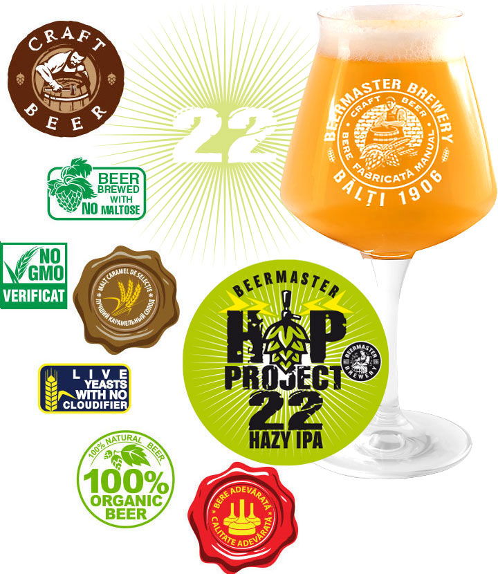 Beermaster HOP PROJECT 22 is a craft beer in the style of Hazy IPA, double hopped, 5.1% ABV, with a super fruity, juicy, slightly bitter character. Ingredients: water, barley and wheat malt, hops, oats, hops and yeast. Oats give the beer a cloudy appearance, and dry hopping creates exotic fruity notes.